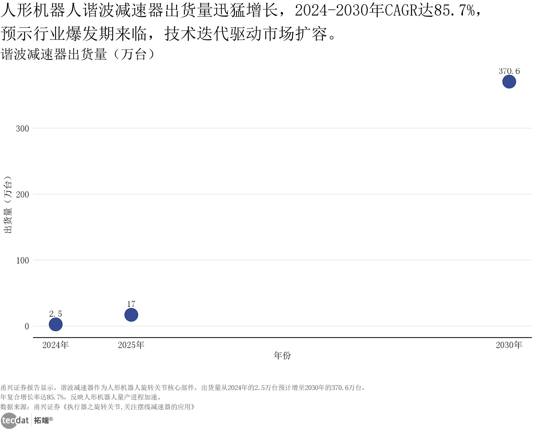 人形机械人正从手艺演示贸易落地:宇树H1机械人实现演唱会高难度伴舞,Figure 02正在宝马工场累计拆载超9万个零件,运转时长冲破1250小时,标记着产物不变性取场景适配性已达适用尺度。焦点零部件成为“卡脖子”环节,此中谐波减速器做为扭转关节焦点部件,2024年至2030年出货量估计从2。5万台飙升至370。6万台,年复合增加率85。7%,需求呈迸发式增加,六年增加148倍。