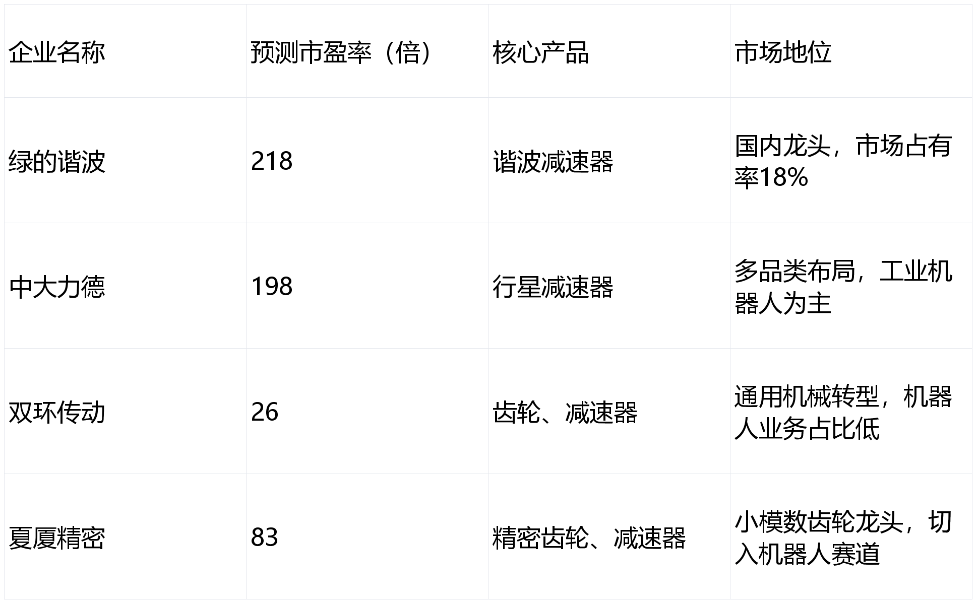 减速器:绿的谐波(国内龙头,市场拥有率18%,谐波减速器标杆)、中鼎力德(多品类结构,笼盖、RV减速器)、双环传动(RV减速器手艺冲破,沉负载场景适配)、夏厦细密(小模数齿轮龙头,切入机械人减速器配套)?。