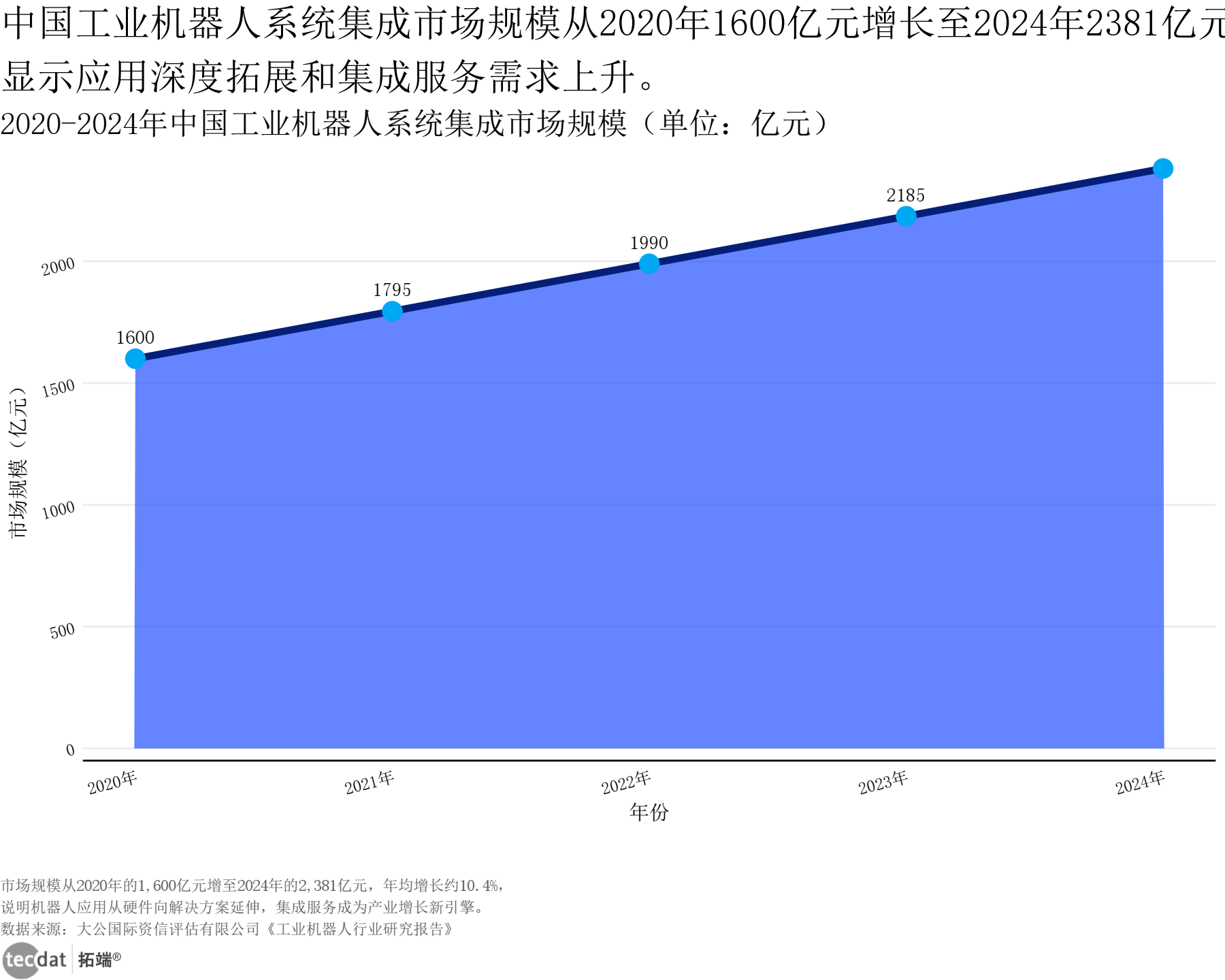 中国工业机械人系统集成市场持续迸发,2020年至2024年规模从1600亿元增至2381亿元,五年增加48。8%,年均增速10。4%。这一增加背后,是制制业从“规模化出产”向“柔性化定制”转型的刚需——保守工业机械人难以适配多品类、小批量出产,而系统集成办事通过定制化方案,实现机械人取现有产线深度融合,成为财产升级的环节支持,其市场占比已从35%提拔至47%,成为行业增加从力。