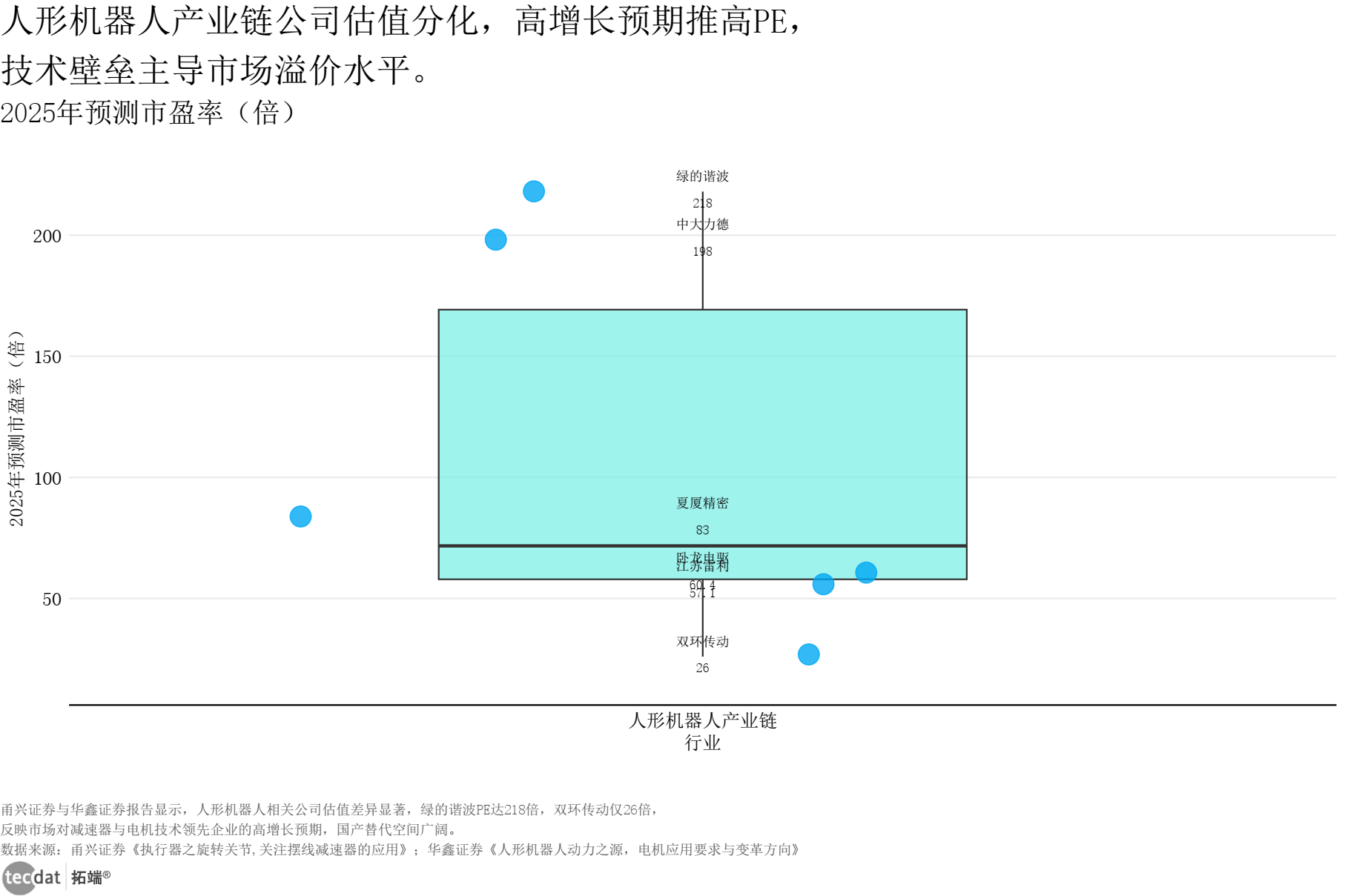人形机械人财产链估值呈现较着分层,焦点零部件企业享有显著估值溢价:绿的谐波2025年预测市盈率达218倍,中鼎力德198倍,而通用机械转型企业双环传动仅26倍。差别焦点正在于手艺壁垒取营业纯度——高估值企业聚焦减速器、电机等“卡脖子”环节,间接受益于量产预期;低估值企业机械人营业占比低,业绩弹性不脚,难以享受行业增加盈利。